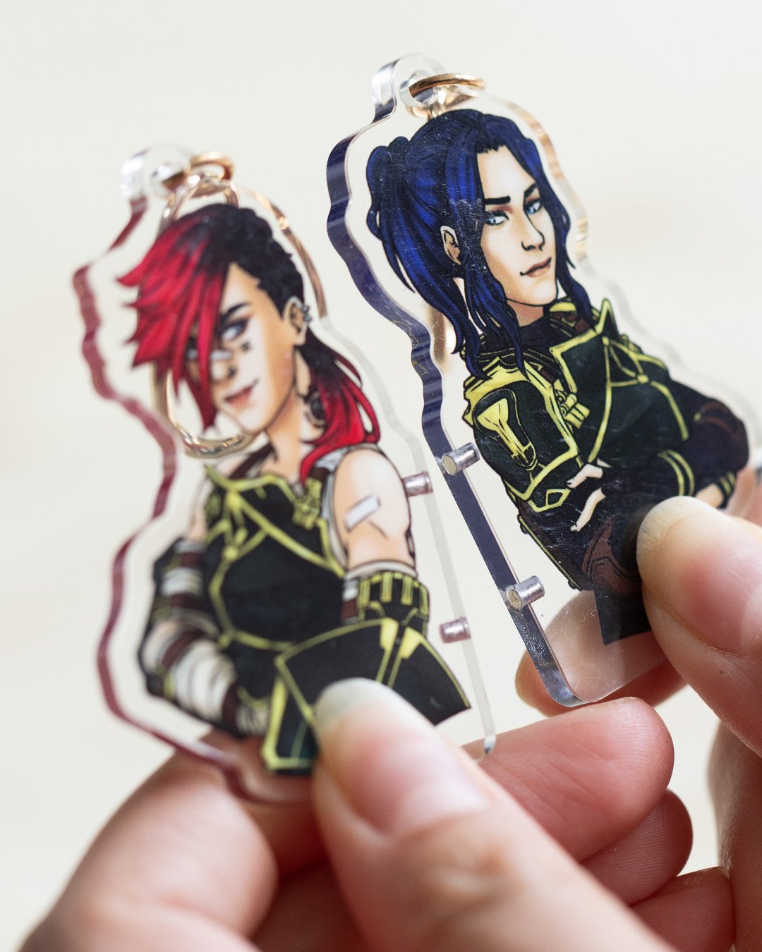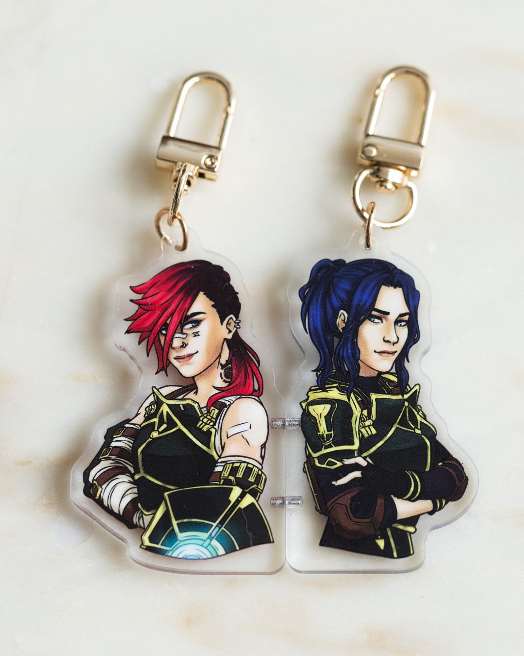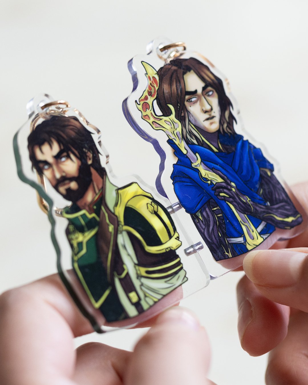 Acrylic magnetic keychains, one sided, size 6 cm, with a golden painted clasp.