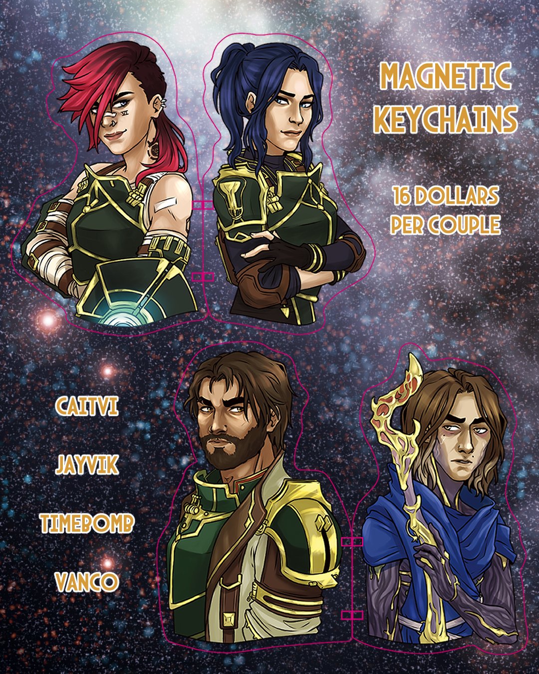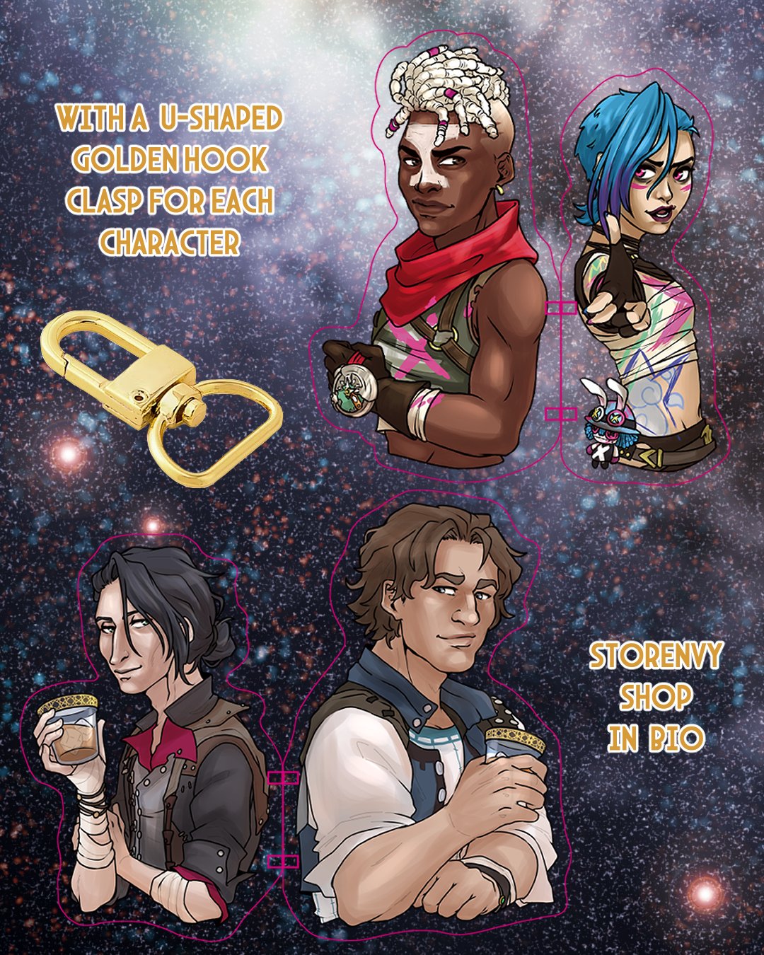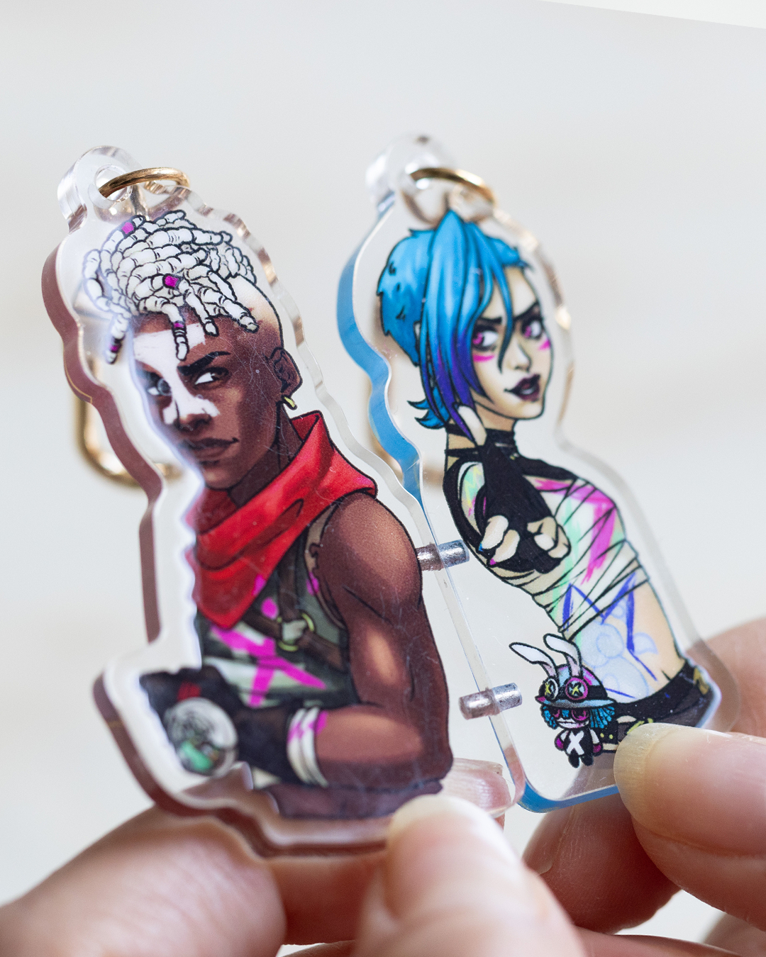 Acrylic magnetic keychains, one sided, size 6 cm, with a golden painted clasp.