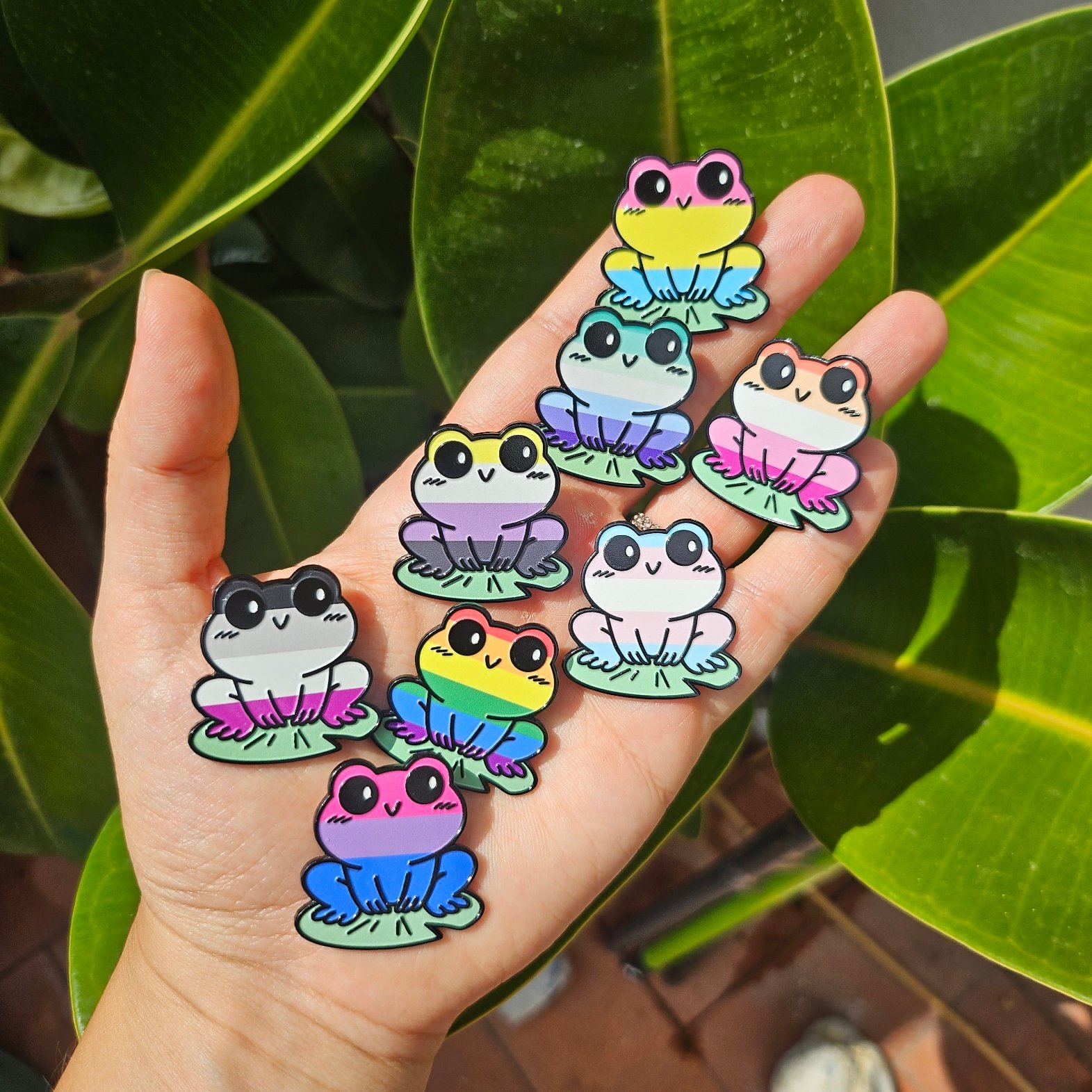Eight different little froggies proud to show you their true "colours" as metal pins, just 1.1" inches in size.